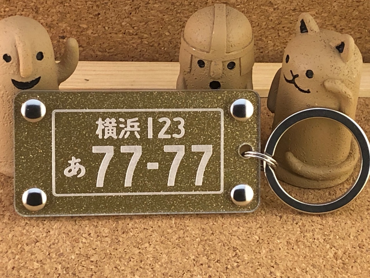 ラメ調で個性的なデザインのナンバープレートキーホルダーです。